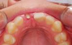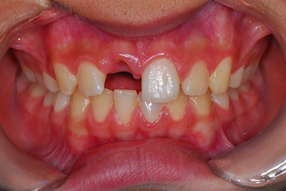 Simple bonded ceramic bridge to replace missing central incisor following trauma until the patient is old enough to have an implant crown (NOTE: We have retained the root to preserve the bone).