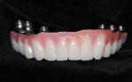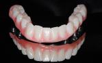 A new upper denture, and a fixed lower metal framework bridge screwed into six implant fixtures.
