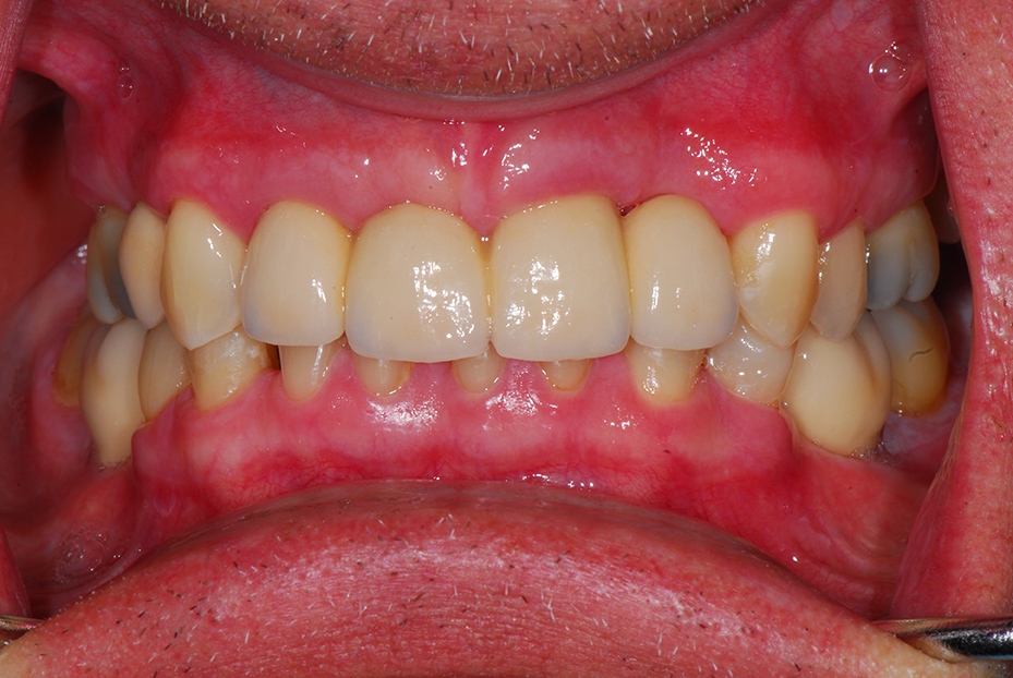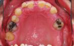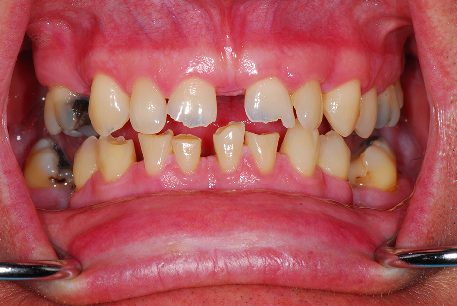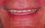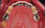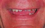 Opening of a collapsed bite with implant crowns and bridges and some simple composite bondings.