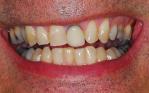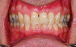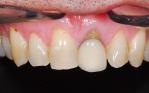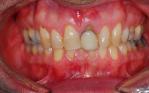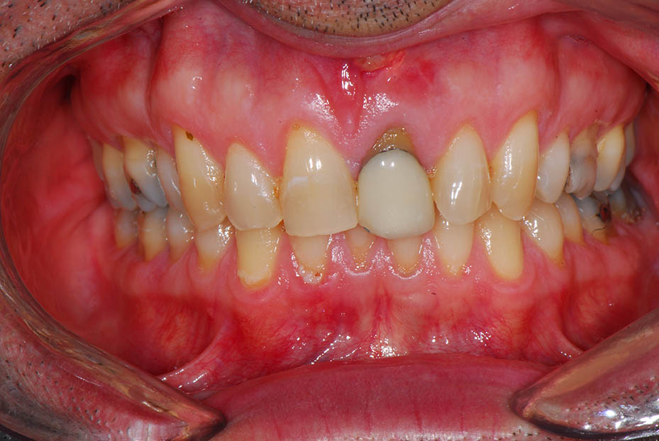 Replacement of badly infected upper left central incisor with a single implant crown.