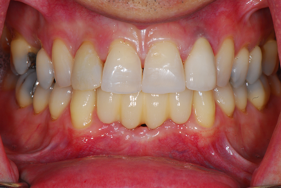 Replacement of all four failing lower front teeth with an implant bridge, some whitening, composite bondings and one new crown on an upper lateral incisor