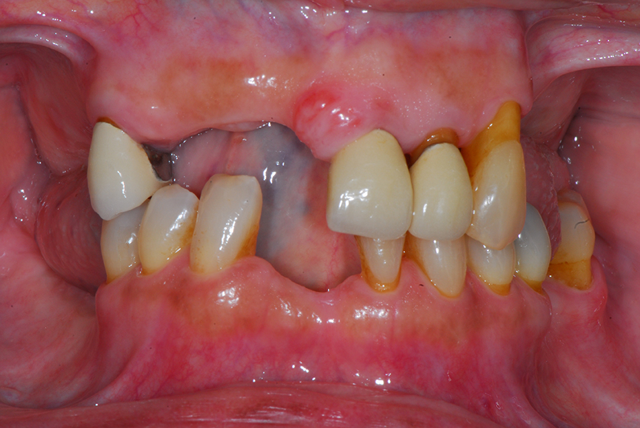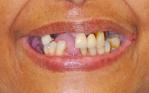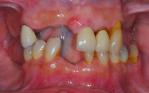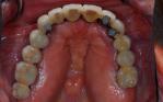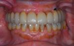 Replacement of all upper teeth with implant supported ceramic bridgework, and implant crowns to replace the missing lower teeth.